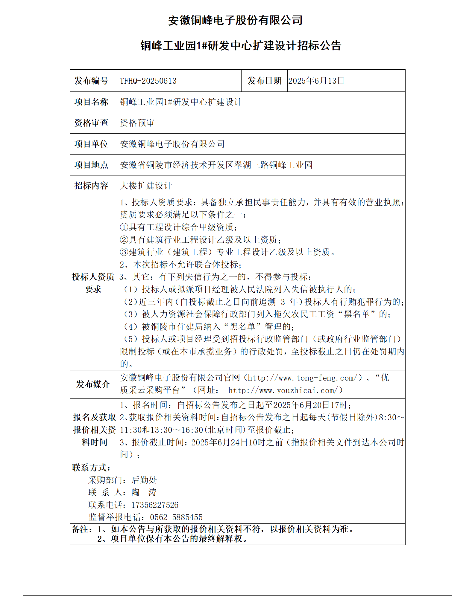 安徽銅峰電子股份有限公司 (銅峰工業(yè)園1#研發(fā)中心擴(kuò)建設(shè)計招標(biāo)公告)_01
