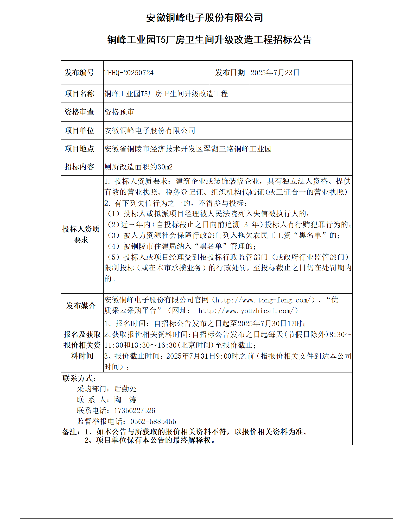 安徽銅峰電子股份有限公司 (銅峰工業(yè)園T5廠房衛(wèi)生間升級(jí)改造工程招標(biāo)公告)_01