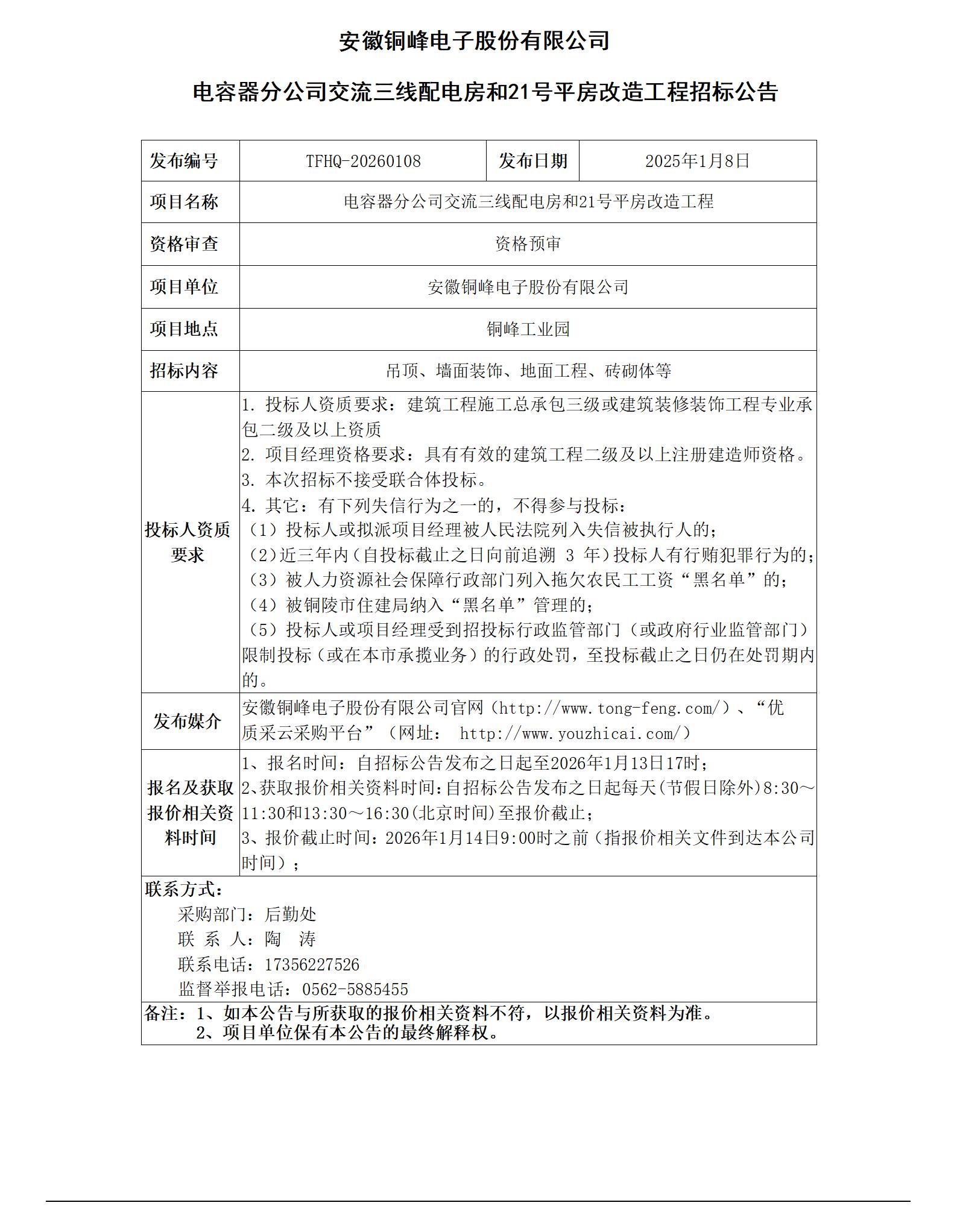 01-安徽銅峰電子股份有限公司 (電容器分公司交流三線配電房和21號平房改造工程 招標公告)_01