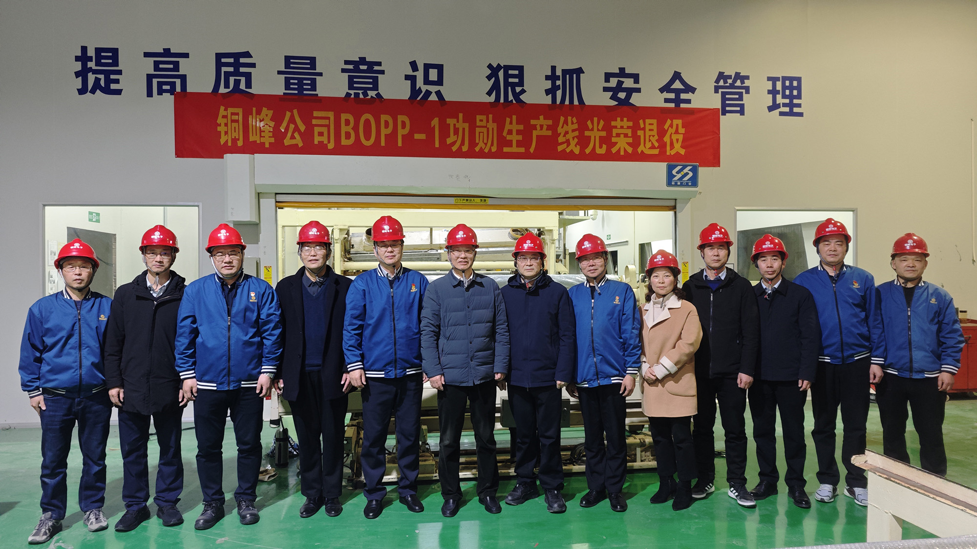 圖為公司黨政領導班子和電容薄膜分公司管理人員與BOPP-1功勛線合影留念