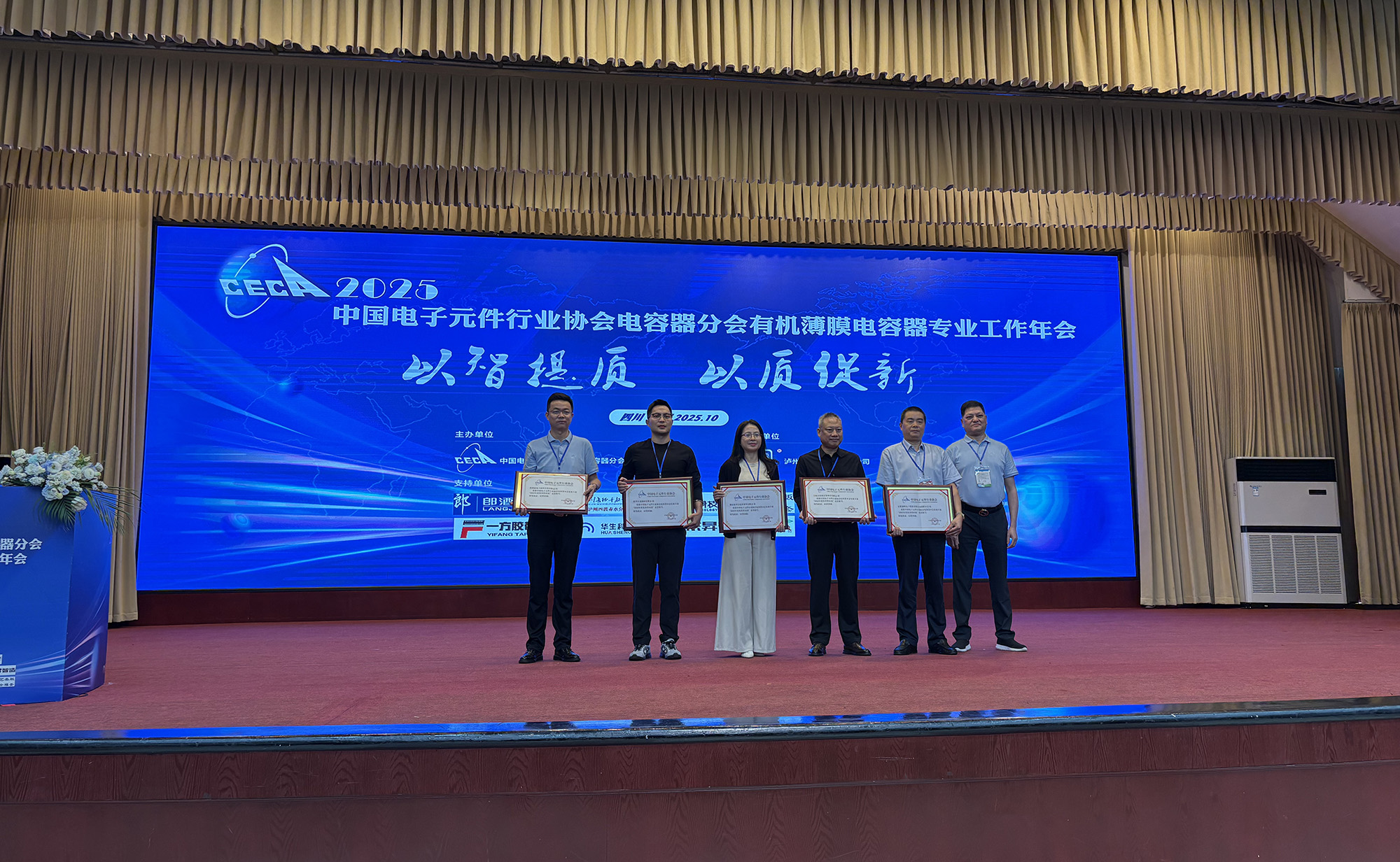 10月14日至17日,中國電子元件行業(yè)協(xié)會電容器分會有機(jī)專業(yè)2025年工作年會在四川瀘州成功舉辦。中電元協(xié)常務(wù)理事、電容器分會第九屆副理事長、公司總經(jīng)理鮑俊華代表公司出席并作主題交流報告。薄膜分公司獲評電容器分會2025年度“優(yōu)秀供應(yīng)商”榮譽(yù)稱號。